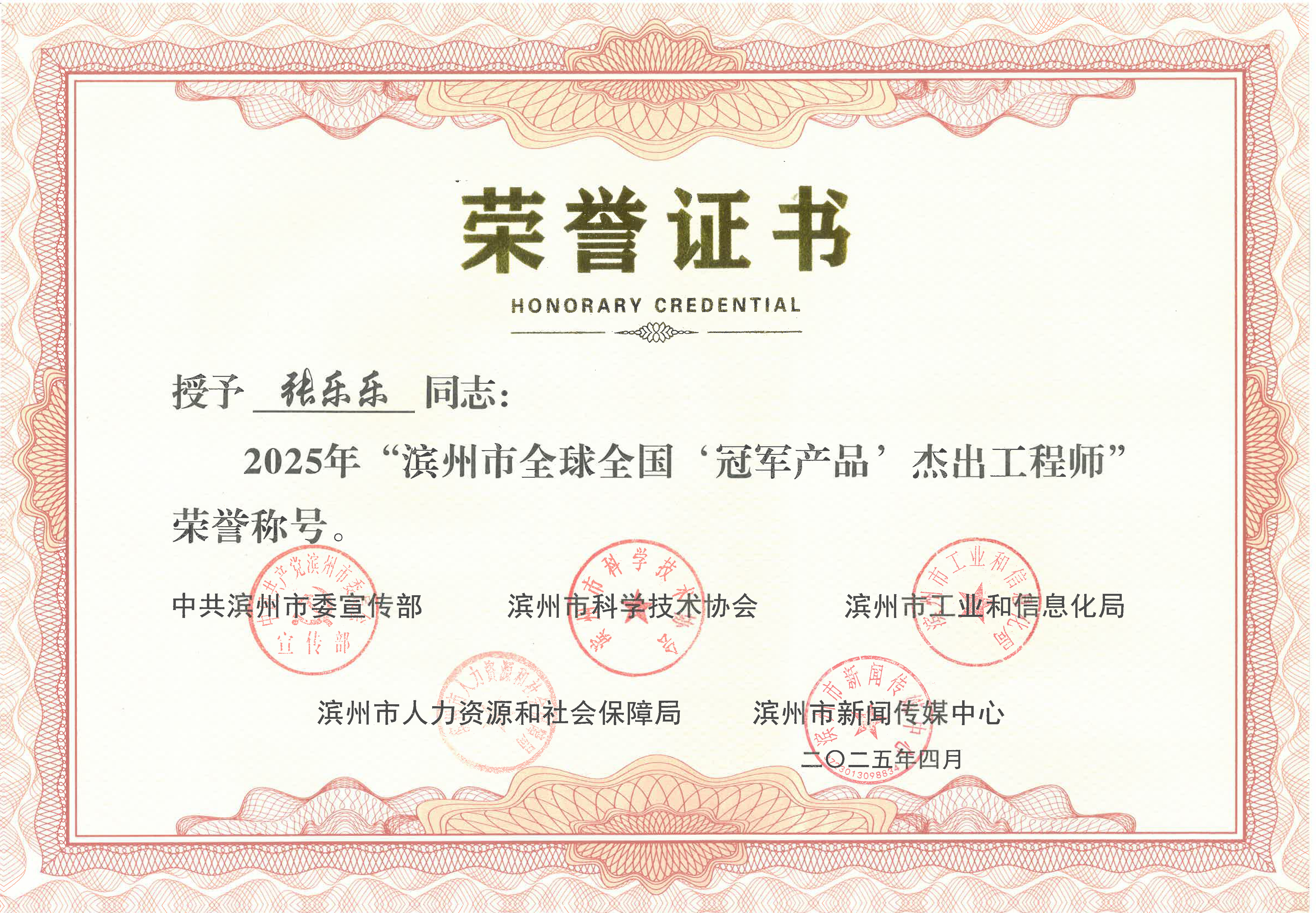 為服務實施制造強市三年攻堅行動,推動科技創新與產業升級深度融合,助力品質濱州建設,7 月,市委宣傳部、市科協、市工信局、市人社局、市新聞傳媒中心(集團)聯合開展了2025 年濱州市全球全國“冠軍產品”杰出工程師選樹宣傳活動。經企業推薦、基層審核等環節,我公司副總經理張樂樂憑借在產業化研發與“冠軍產品”培育中的突出表現,成功入選“濱州市全球全國‘冠軍產品’杰出工程師”名單,躋身 64 名獲選者之列。