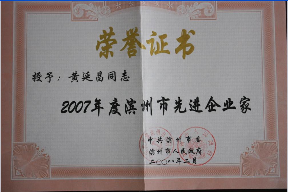 2008年2月,我公司董事長黃延昌被濱州市市委和濱州市人民政府評為2007年度“濱州市先進企業家”。