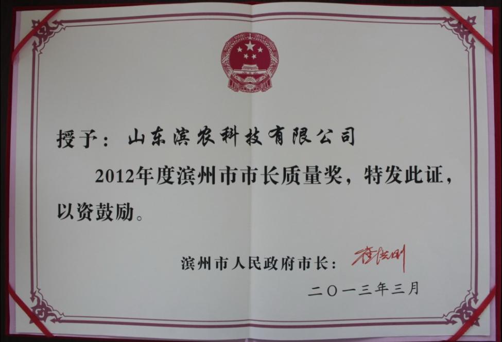 2013年3月13日,濱州市人民政府濱政字【2013】37號文件《關(guān)于表彰2012年度濱州市市長質(zhì)量獎獲獎單位和個人的通報》,公布了2012年度市長質(zhì)量獎的獲獎企業(yè)和個人名單。 我公司喜獲2012年度濱州市市長質(zhì)量獎。