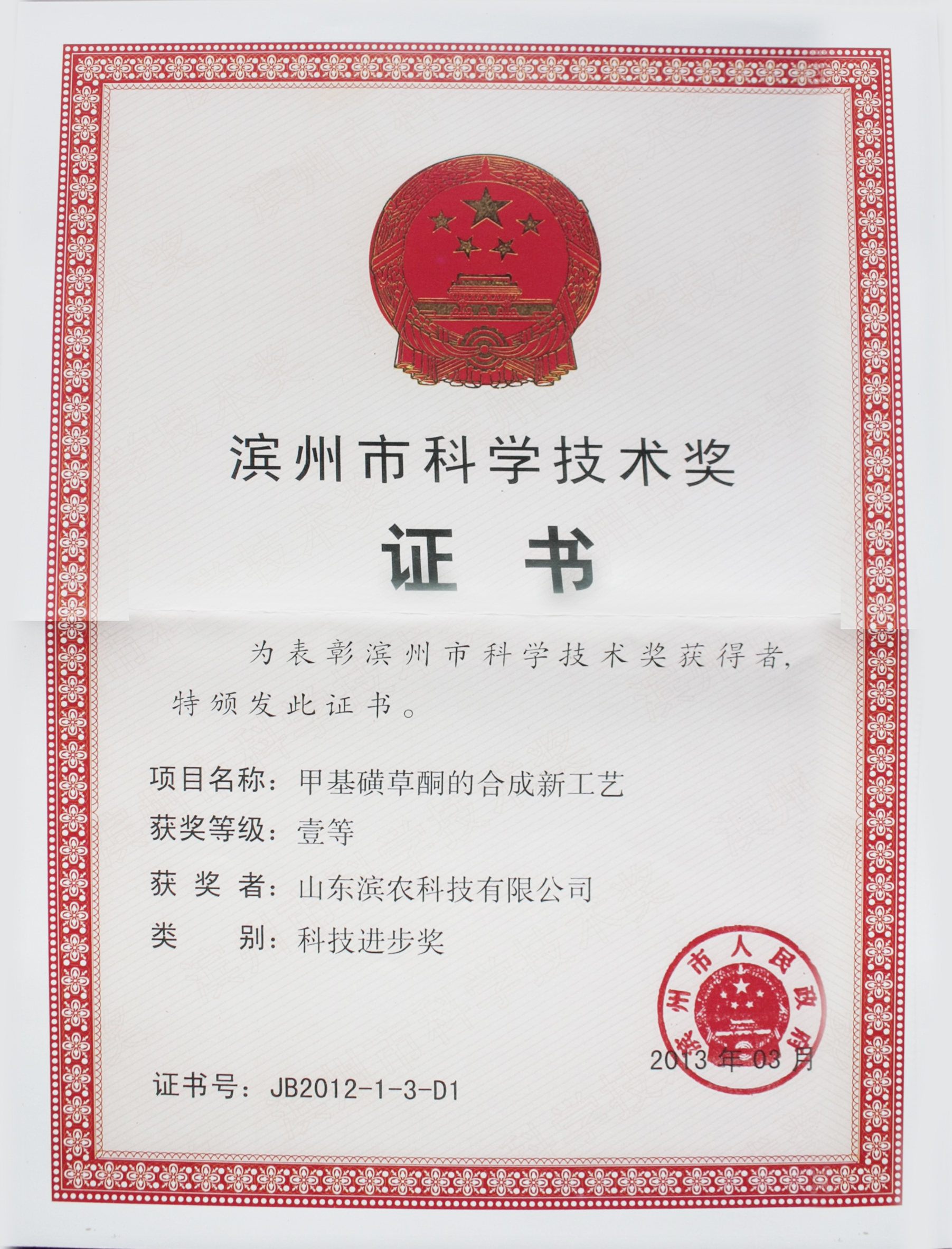 2013年3月,我公司自主研發(fā)的甲基磺草酮的合成新工藝被濱州市人民政府評為科學(xué)技術(shù)獎一等。