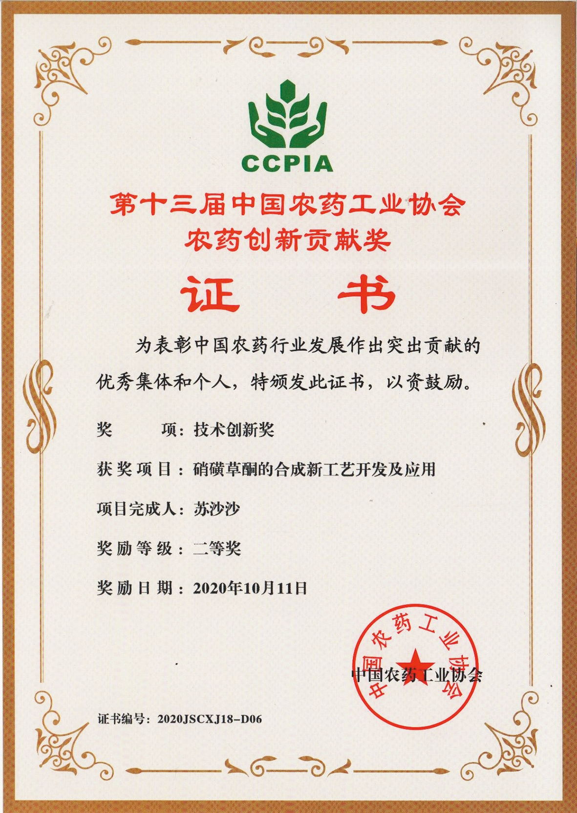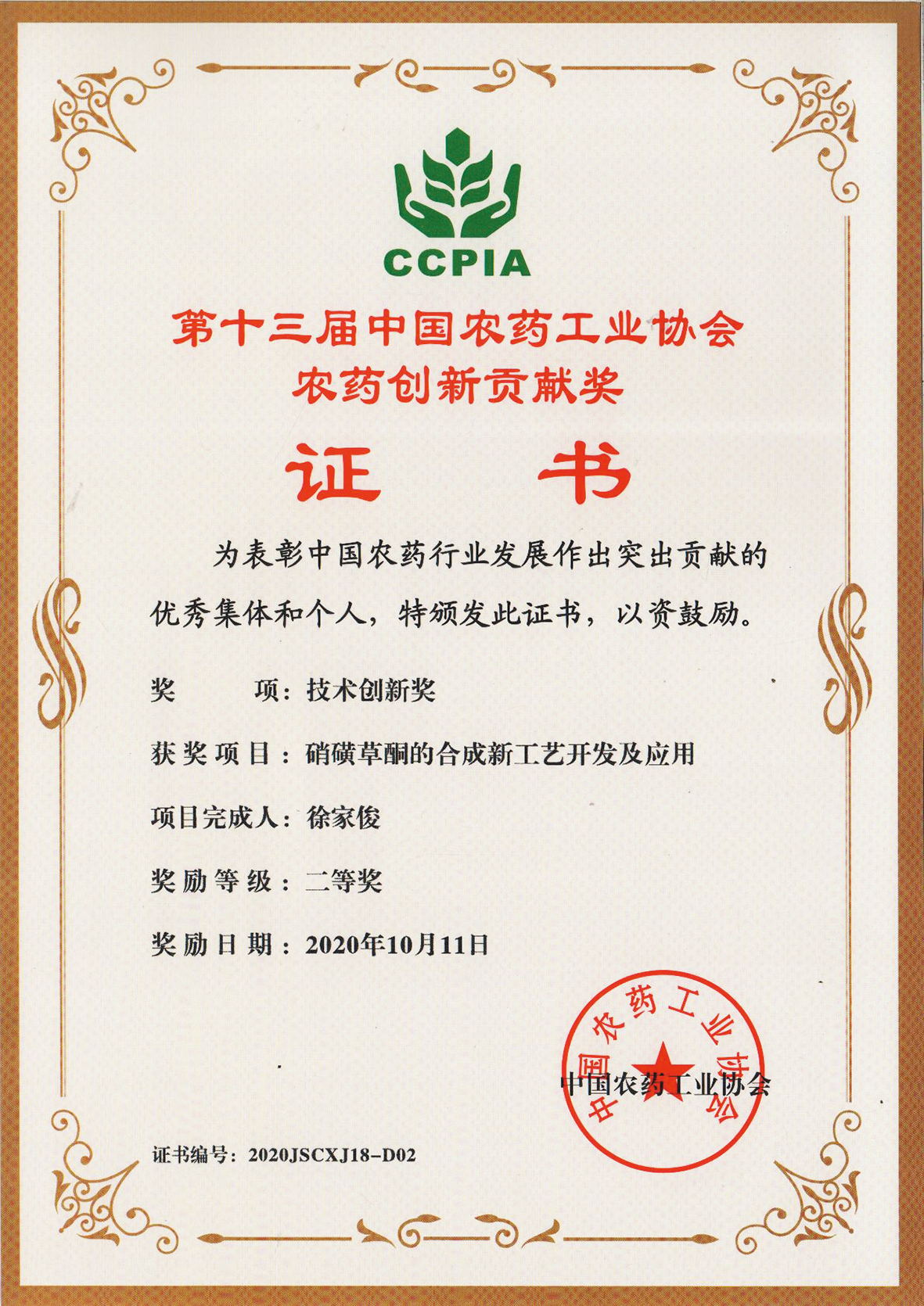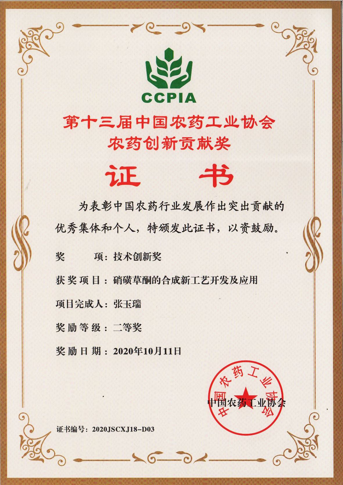 ■2025-09-09 我公司丙炔氟草胺原藥合成新工藝的開發(fā)項目榮獲第十八屆中國農(nóng)藥工業(yè)協(xié)會科