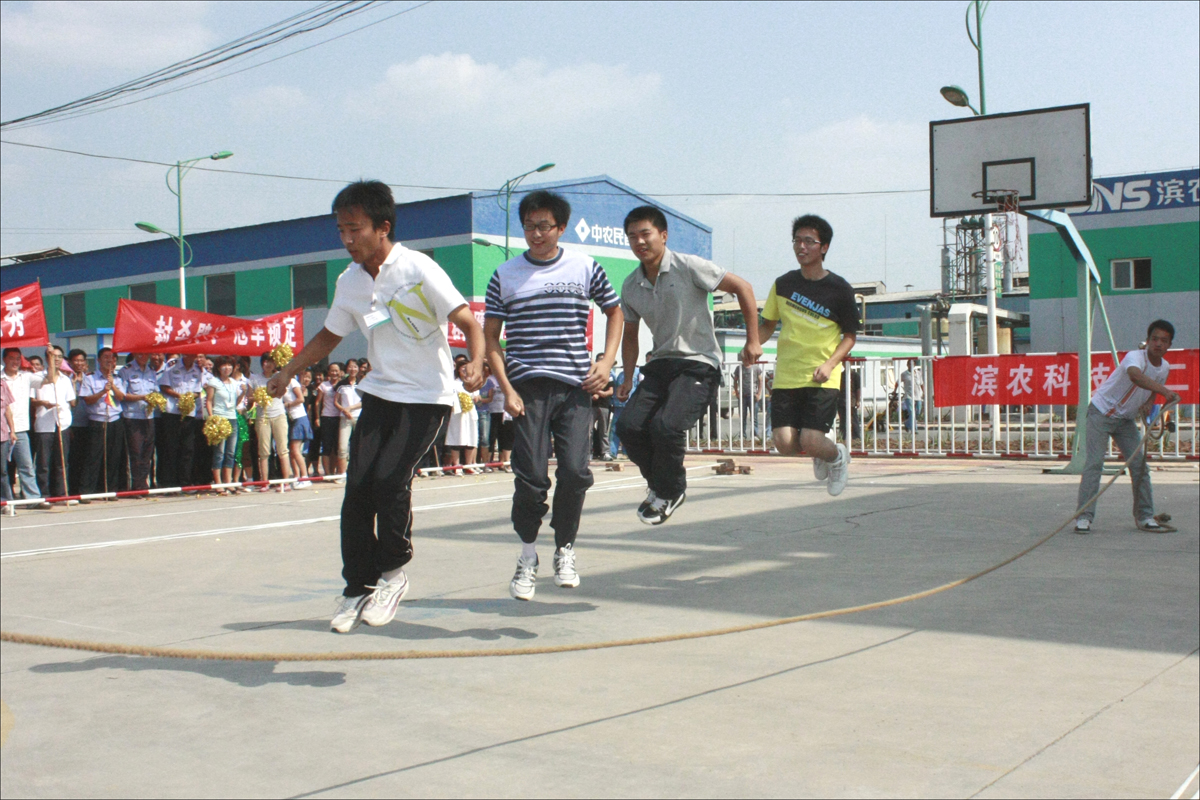 開幕式上,濱農禾韻藝術團團員高舉藝術團團旗走在前列,各參賽運動員代表本隊依次展示入場。副總經理孟令濤擔任總裁判長,并熱情洋溢地致開幕詞。比賽項目包括跳繩、拔河、單腳火車跑、“迷你”鐵人三項和雙腿夾球接力五項,各項目雖簡單快樂有趣,卻非常考驗運動員之間的配合和默契。