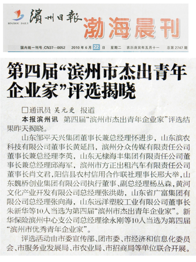 第四屆“濱州市杰出青年企業(yè)家”評選結(jié)果已于6月22日揭曉,我公司董事長黃延昌等10位優(yōu)秀企業(yè)家當(dāng)選為第四屆“濱州市杰出青年企業(yè)家”。評選活動由市委宣傳部、團(tuán)市委、市經(jīng)濟(jì)和信息化委員會、市服務(wù)業(yè)發(fā)展局、市農(nóng)業(yè)局、市招商局等單位聯(lián)合開展。